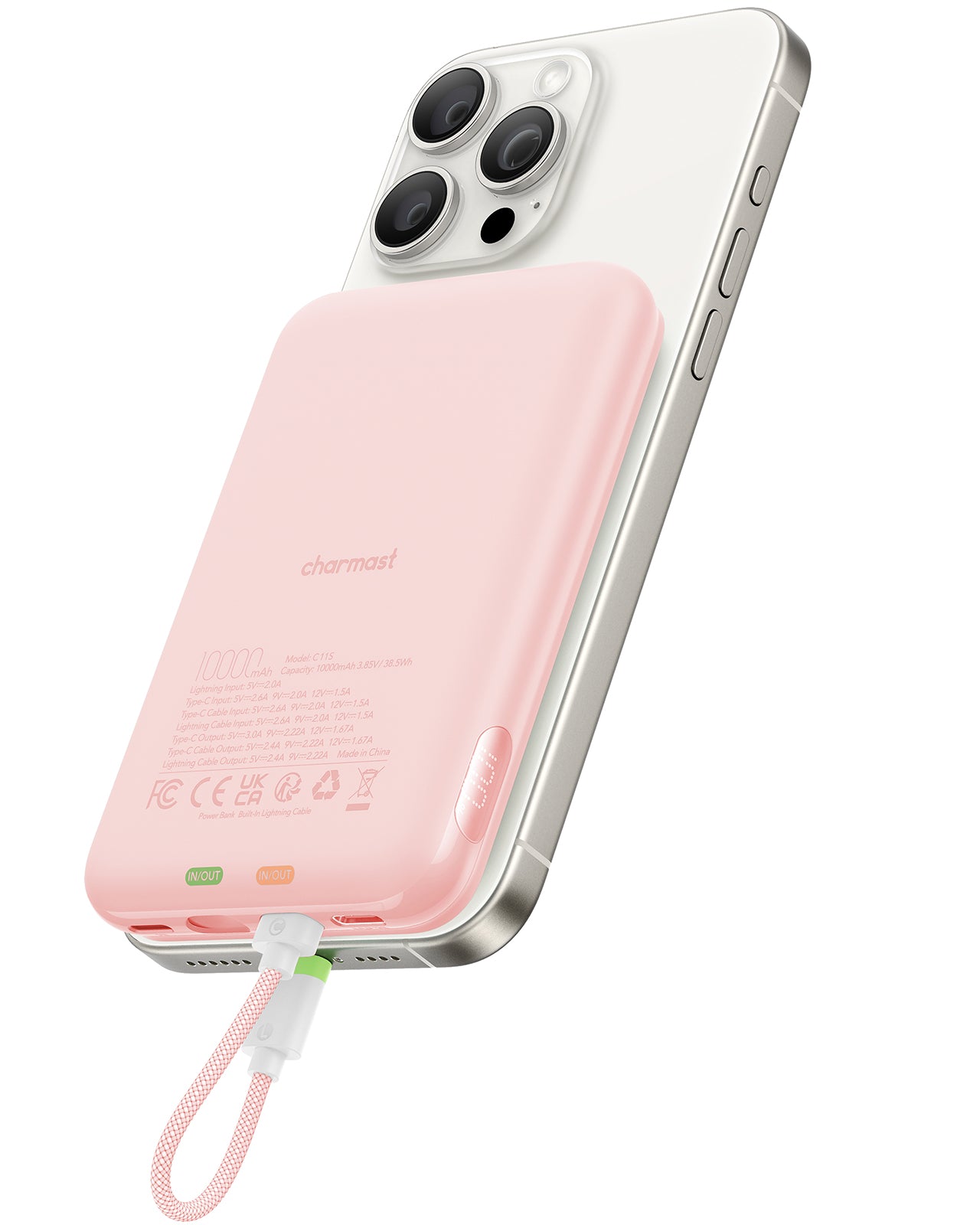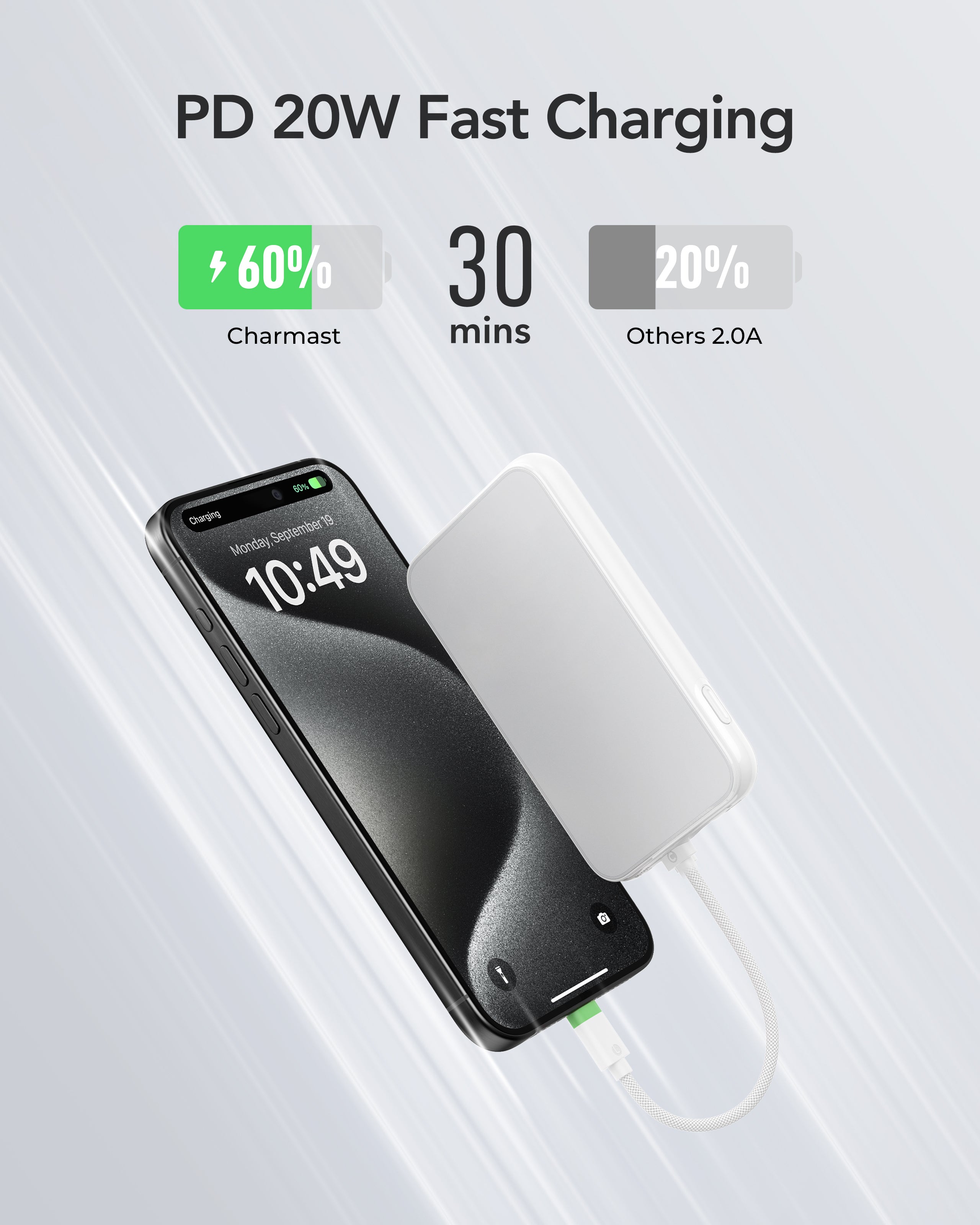 The Charmast 10000mAh Slim Power Bank offers fast 20W PD charging and a built-in input/output cable for iPhone, Android, and other devices. Compact and lightweight (4.44 x 2.72 x 0.64 inches, 0.4 lbs), it’s easy to carry and ideal for travel. The digital display shows remaining power, while the sleek design comes in seven stylish colors. With 1.5 charges for iPhone 15 Pro Max and 1.9 for iPhone 14, this versatile power bank meets everyday charging needs.