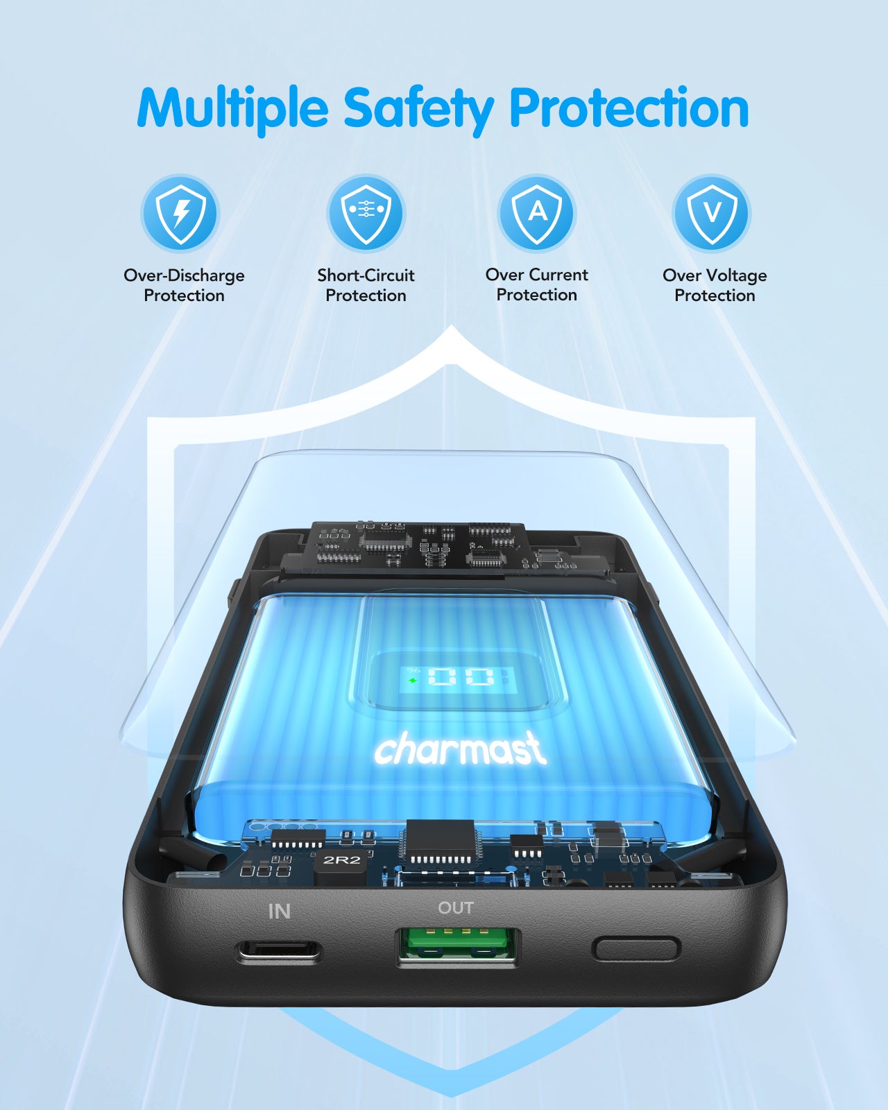 Travel light and stay powered with the Charmast 20000mAh Portable Charger. Featuring built-in cables, a wall plug, and universal compatibility, it’s perfect for all phones. Enjoy 20W PD and 18W QC 3.0 fast charging, boosting devices like iPhone 13 or Samsung S21 in just 30 minutes. With a massive capacity, it provides multiple charges for iPhone, Samsung, and Google Pixel devices. Compact, durable, and lightweight at 12.99 oz, it’s designed for convenience and reliability.