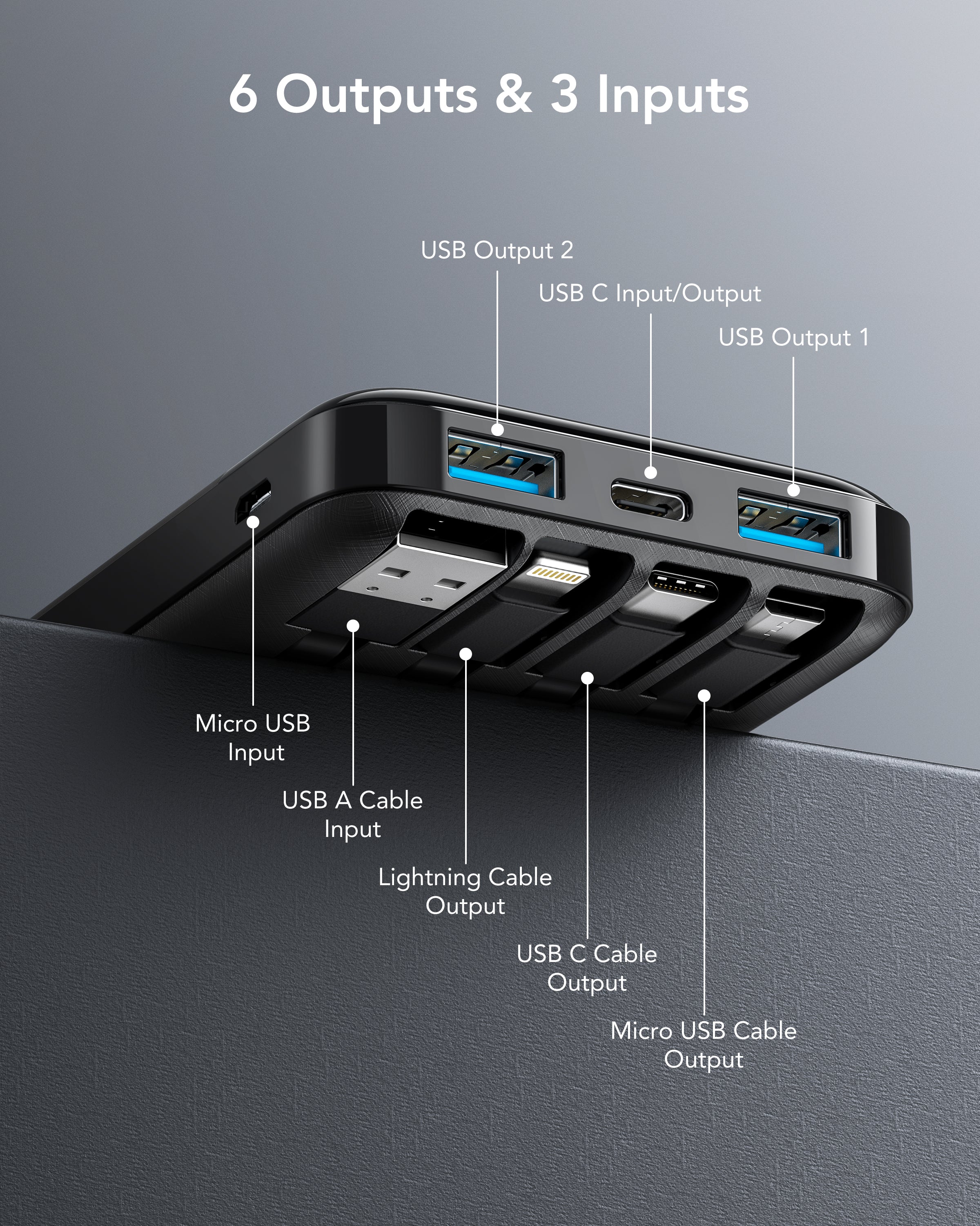 Compact and powerful, this slim 10,000mAh portable charger features built-in cables for universal compatibility with iPhone, Android, tablets, and more. With 6 outputs and 3 inputs, it can charge up to 6 devices simultaneously. The LED display ensures you always know the remaining battery life. Weighing just 0.53 lb, it's perfect for travel or daily use.